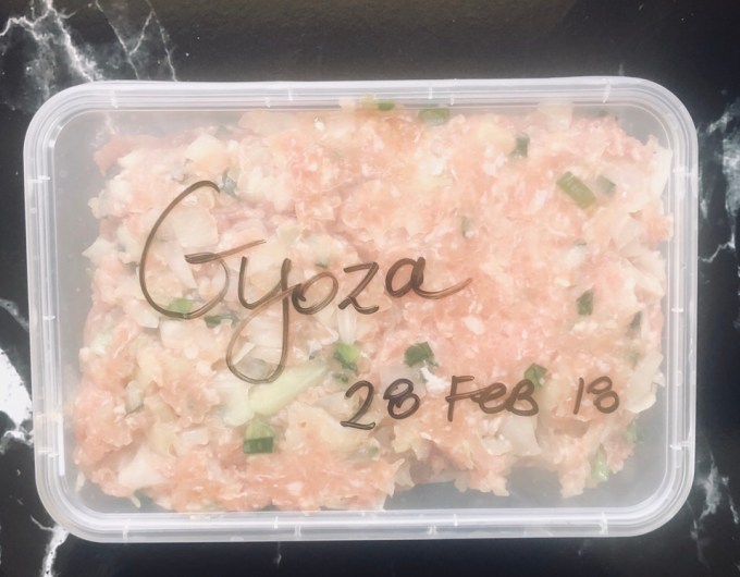Gyoza dumplings (this mince recipe makes enough for 2 packets of gow gee wrappers – 48 dumplings. If you are only cooking for a couple of people, you can freeze the left over mince and use it another time). It is a good recipe as you do not need any fancy steamers or utensils.