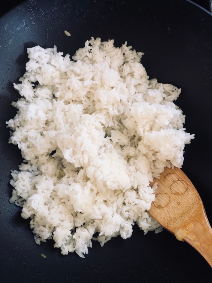 It is important to “fry” the rice. Coating the grains in the vegetable oil helps the rice grains stay separated and results in a less “gluggier” fried rice.