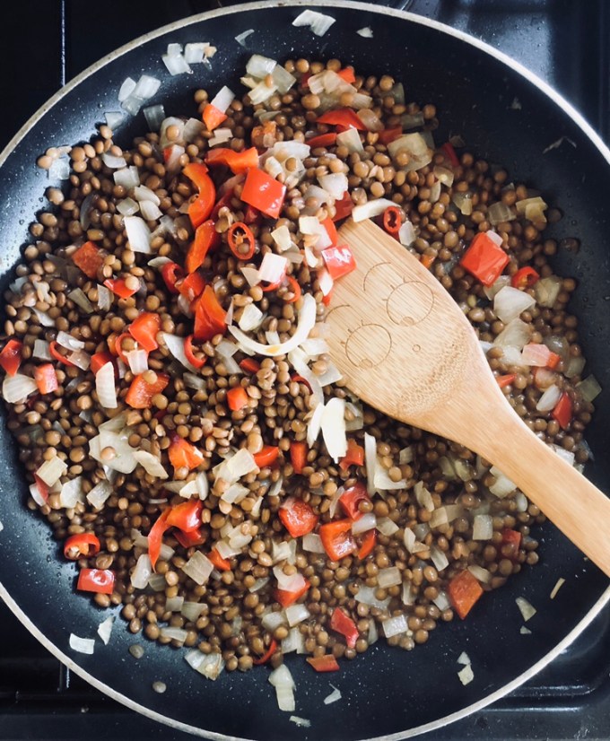 - Simply add the drained lentils to the fry pan and stir until combined.