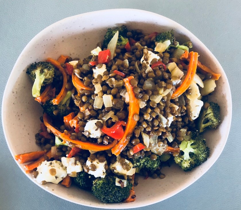lovely lentils w roasted carrots + broccoli + feta