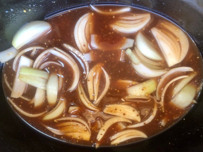 - Place the onions, garlic, mustard, sugar, vinegar, tomato sauce, water and Worcestershire sauce in to a slow cooker and stir.