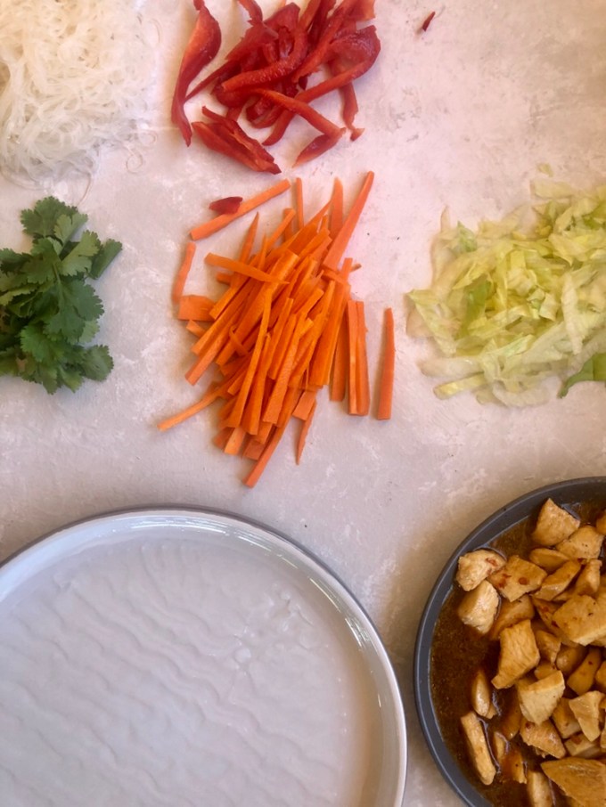 - Of course if you want to make these in to rice paper rolls, submerge the rice paper sheets one at a time in to a large shallow bowl of hot water (not boiling) until the paper has become translucent and pliable. On a clean surface, place the rice paper down and layer the coriander leaves, noodles, vegetables and chicken (spooning some of the sauce over the top) and roll tightly in to a cigar shape. Serve with chilli sauce, sweet chilli sauce or soy sauce.