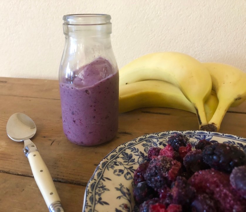 Anyone up for some ‘purple ice-cream?’ AKA a banana and mixed berry smoothie. Makes for the perfect breakfast or easy snack for you and the kids and if you’re like me – when 3 o’clock rolls round – you’re looking for something to get you through to dinner time.
