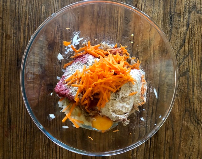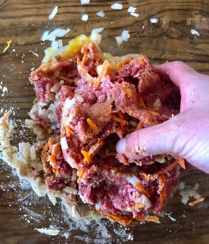- Put the mince, onion, breadcrumbs, carrot, garlic, mustard, Worchestershire sauce, tomato sauce, oregano, parsley, egg and salt and pepper in to a large bowl and mix using your hands.