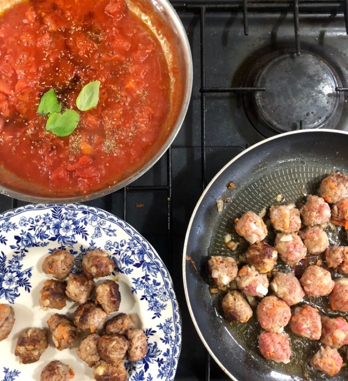 - Don’t overcrowd the pan when frying the meatballs and make sure that the heat is right. Too high a heat and the meatballs will burn on the outside but won’t cook through properly.