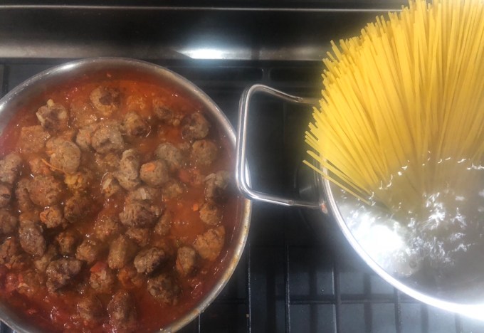 - Once the spaghetti is cooked and the meatballs in the sauce are heated through and looking good, you’re right to serve.