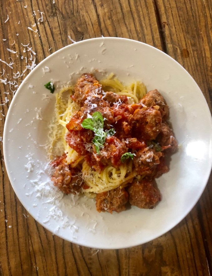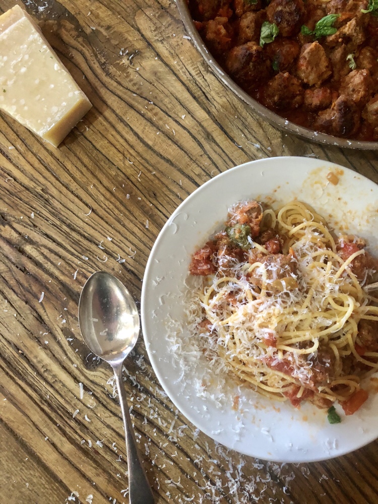 There’s something that little bit romantic about eating a big bowl of spaghetti and meatballs that you don’t get with spaghetti bol. It reminds me of Lady and the Tramp sitting at the red and white checkered table out the back of Tony’s Italian. Oh how I loved that movie growing up and thought the little restaurant scene was the best thing in the world.