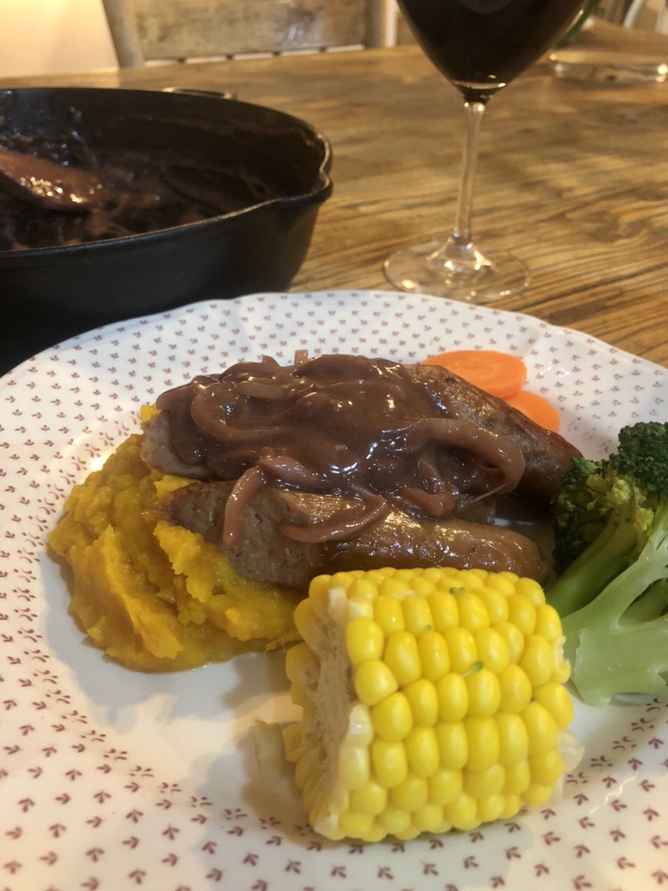 sausages in a red wine + onion gravy | served w mashed pumpkin + steamed veggies