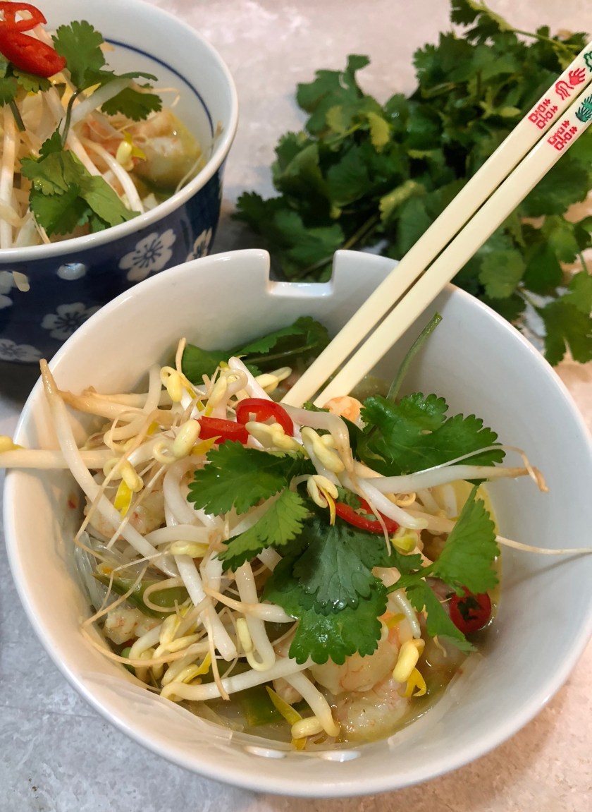 This prawn Laksa is the quickest and easiest soup you can make and although I hardly ever have fresh coriander and bean sprouts in the fridge, you can buy all of the ingredients at the supermarket. I often keep frozen prawns in the freezer for dishes such as this and you can make it as mild or as spicy as you like.