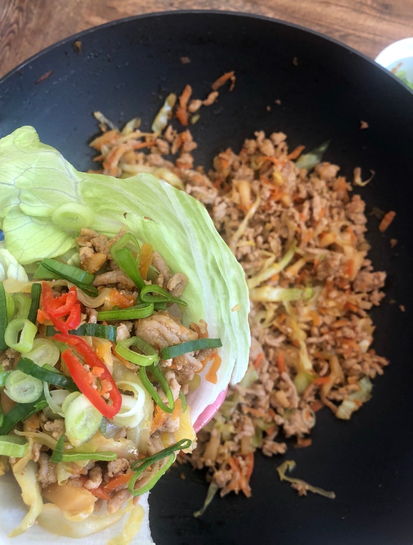 - To serve, spoon a generous tablespoon of mince in to a lettuce leaf. Sprinkle the spring onions and chilli over the top and drizzle over some soy sauce. Do your best to fold in to a parcel and dig in. (I serve this with steamed rice as well for a more rounded out meal).