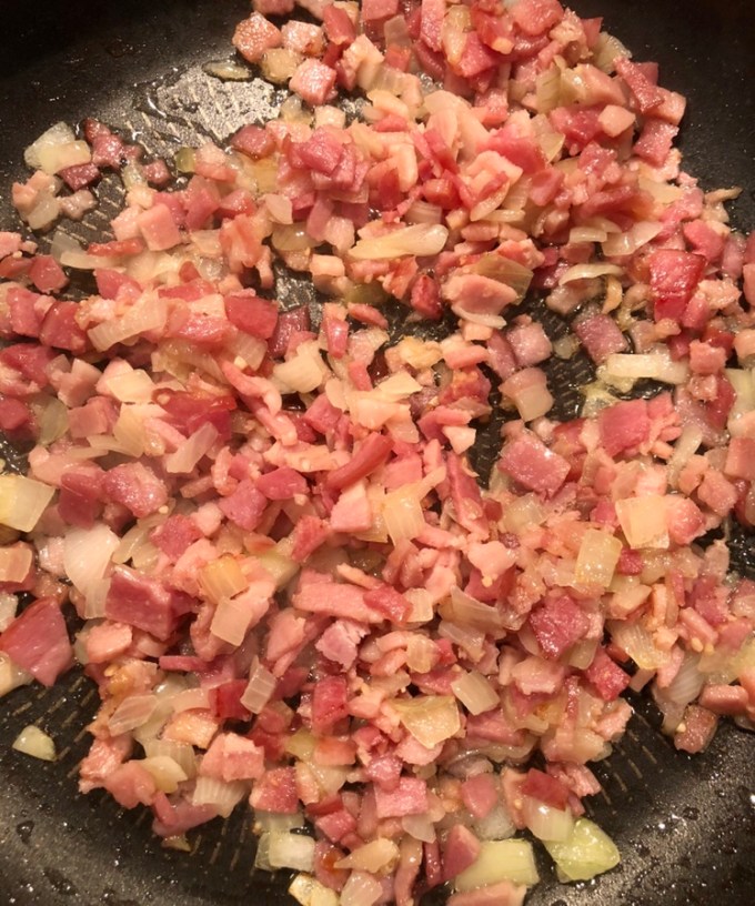 - Meanwhile, in a large fry pan add a dash of olive oil and brown the onions and bacon, adding the garlic after a couple of minutes.