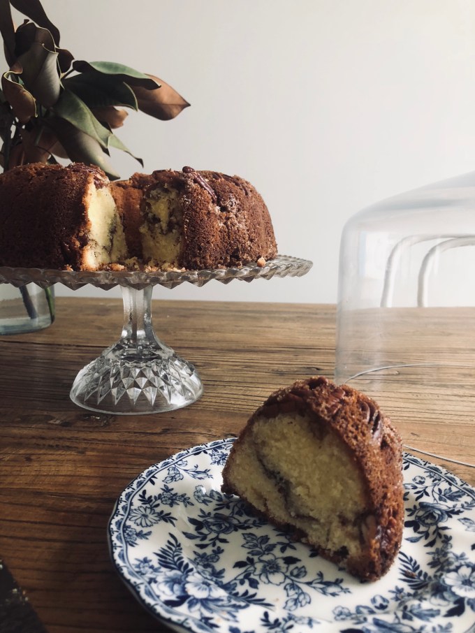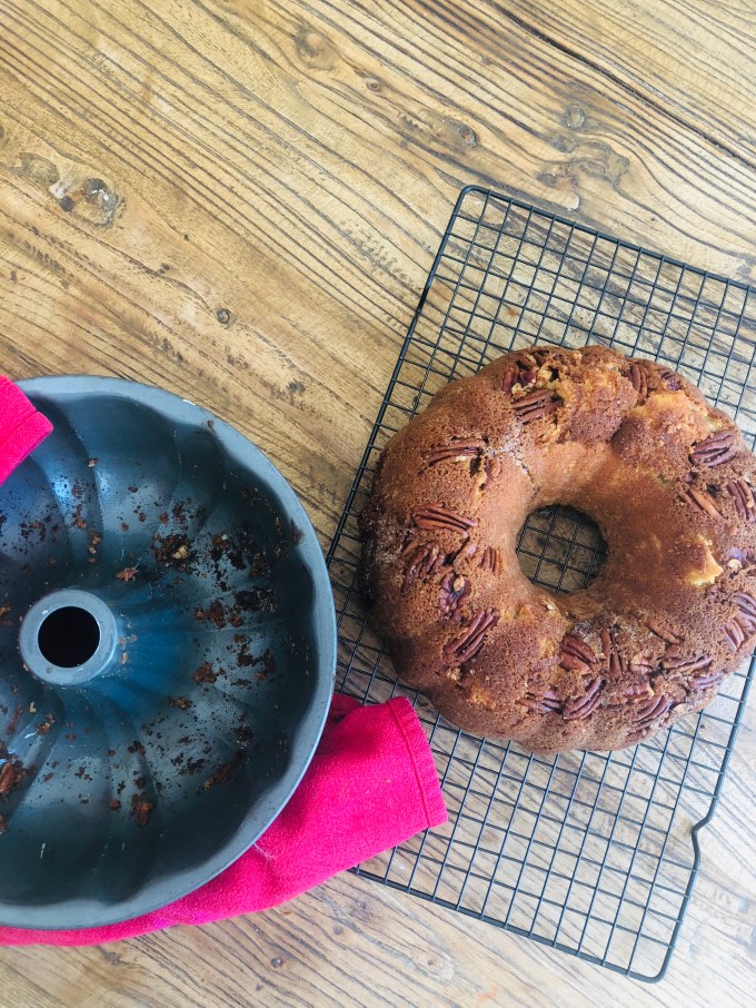 • You can use a large round cake tin instead if you don’t have a bundt tin handy. If you do this, you will want to layer the cake differently so that the top of the cake has the pecan mixture on top once cooked (remembering that a bundt cake gets turned out of the tin). Instead, put the cake batter in first, followed by the pecans and so on.