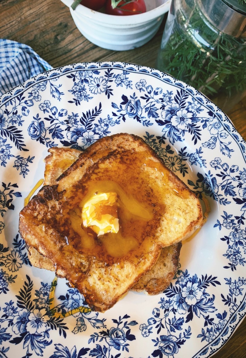 So convinced of my new found ‘essential-ness’, I happily put down the pile of washing to be folded and skip off to make a batch of French toast. Hot, buttered, comforting French toast; something to make our morning at home that little bit sweeter. The smile on my face makes me think that I could re-write and share with you my acrostic poem after all. Because as Soph says, “people DO need to eat”.
