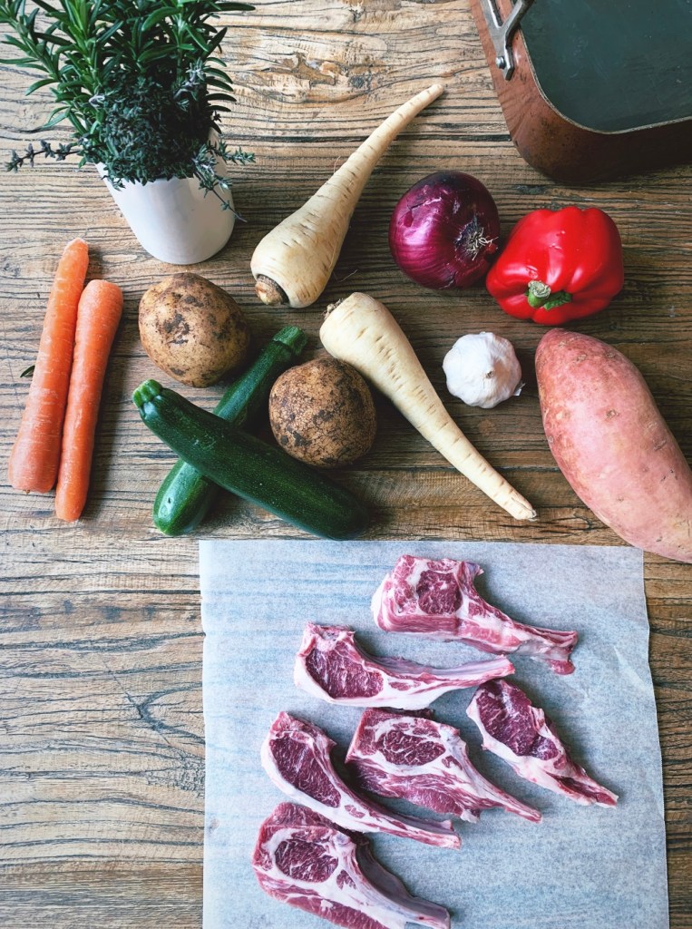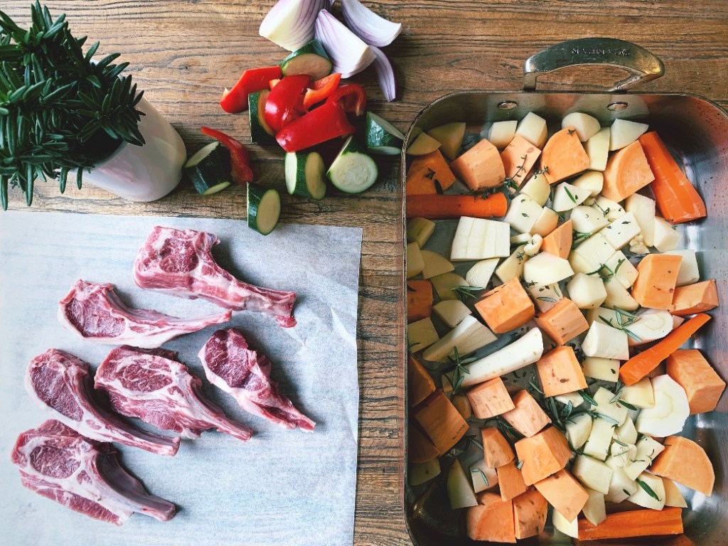 Fresh herbs such as rosemary and thyme really make it sing and you can even cook the veggies in the morning so all you need to do when your guests arrive, is take them out of the fridge, nestle in your lamb cutlets and whack back in the oven. It’s so easy. So simple. So tasty.