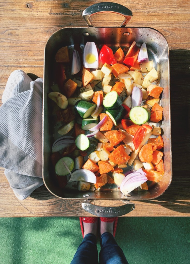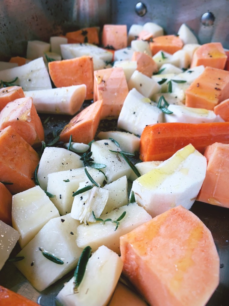 - Add the potatoes, sweet potato, parsnip, carrot and garlic to a large roasting dish (or divide it between two if you need to so that it all fits). Add a generous amount of fresh rosemary and thyme, drizzle with olive oil and season well with salt and pepper. Whack it in the oven for approx 20-30 minutes or until the vege have had a good head start.