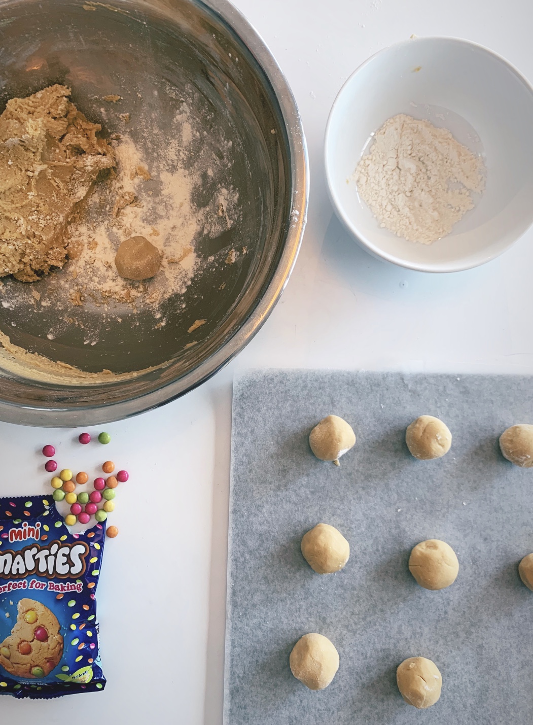 - Dust your hands in plain flour (as the mixture will be quite wet and sticky) and roll in to large teaspoon sized balls, arranging on the baking trays leaving lots of space in between so that they can expand when cooking.