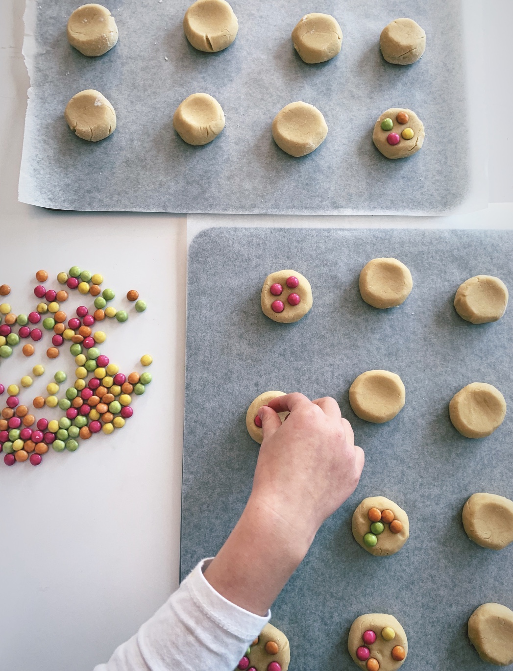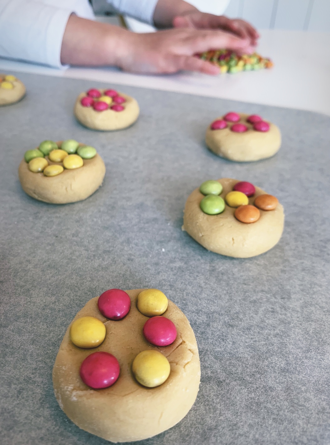 - Flatten the cookies slightly with the back of a wooden spoon. Decorate with the smarties.