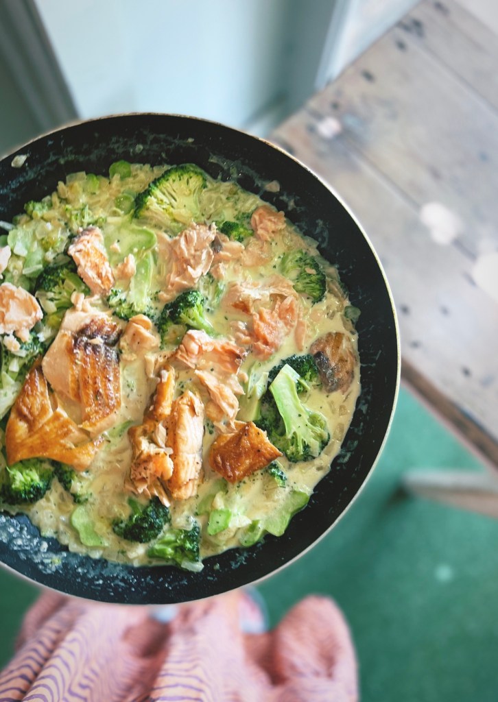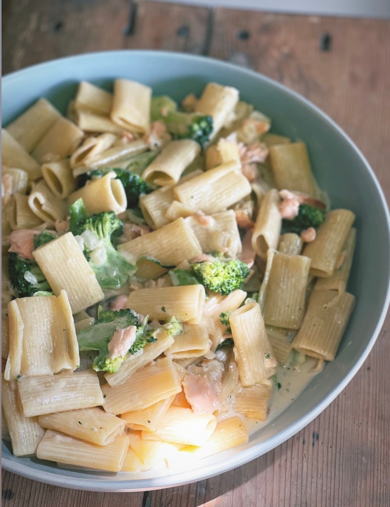 You’ll of guessed that this easy salmon and broccoli pasta is no exception. Made with a base of onion and garlic and then lashings of cream and grated cheese, I think the addition of the chicken stock cube makes it even tastier. I always have salmon fillets in the freezer and obviously you can use whatever type of pasta you have handy. For some reason, I’m on a bit of a rigatoni roll at the moment.