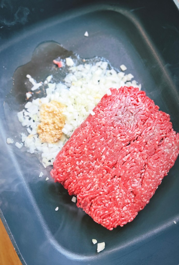 - Whack the mince, onion, garlic and ginger in to a hot fry pan with a dash of oil and season with salt and pepper. Let it brown really well whilst breaking the mince up and stirring with a wooden spoon.