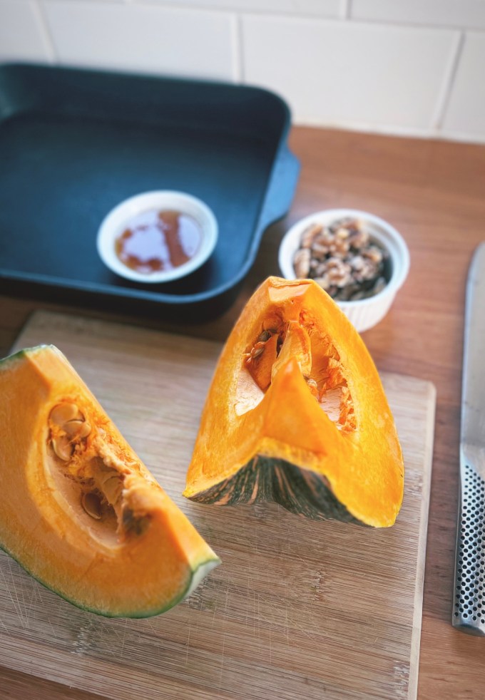 Made using minimal ingredients, all you need is pumpkin, a handful of walnuts and some maple syrup, a drizzle of olive oil and a good seasoning of salt and pepper. It’s literally prepared in minutes and then the oven does all the work. The pumpkin roasted this way becomes incredibly tender and with the addition of the maple syrup, it caramelises it beautifully.