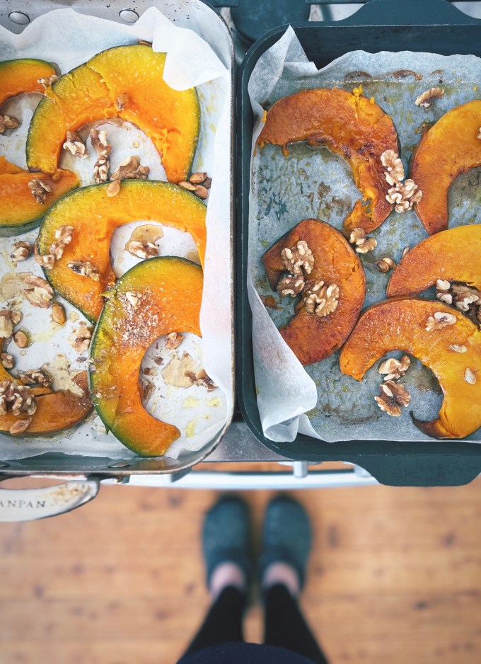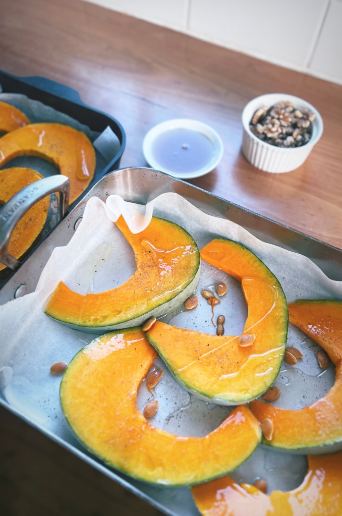 - Take out of the oven, flip the pumpkin over, drizzle with maple syrup and scatter the walnuts over top. Add a little more olive oil and salt and pepper on that side and roast again until caramelised nicely.