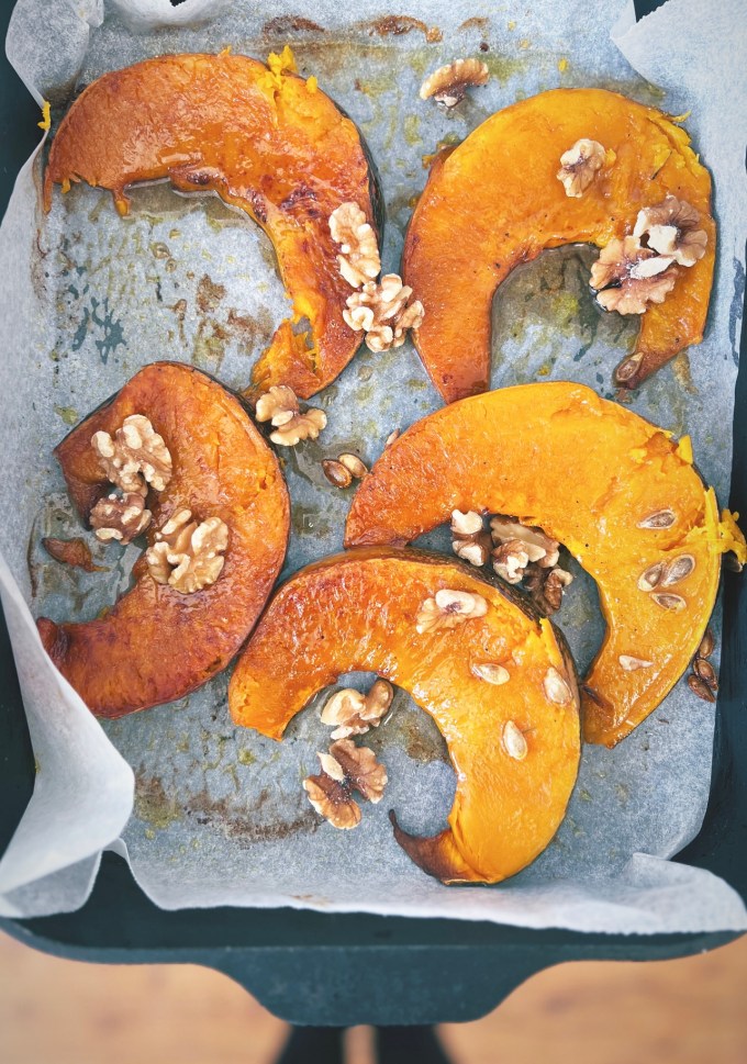 It’s a stroke of genius. Of course there’s nothing wrong with turning up to someone’s house with a box of choccies in hand, but if you want to go that extra mile, why not offer to bring this delicious roast pumpkin with walnuts. It’s easy to make and goes all too well at a barbecue along with some grilled meat and salad. I’m always looking for some new inspiration when it comes to salads and veggie dishes when we have friends over.