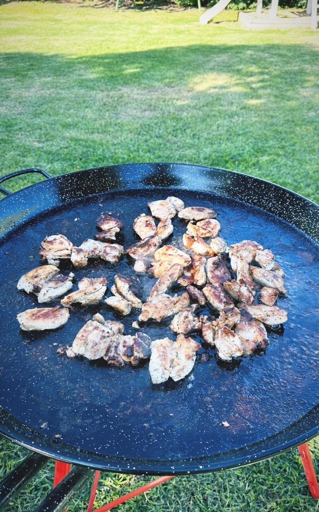 Along with the usual sausages on bread for the kiddies, we grilled some chicken on our outdoor paella pan, teaming it up with some delicious maple glazed roast pumpkin, potato bake and a simple Greek salad recently when friends were over.