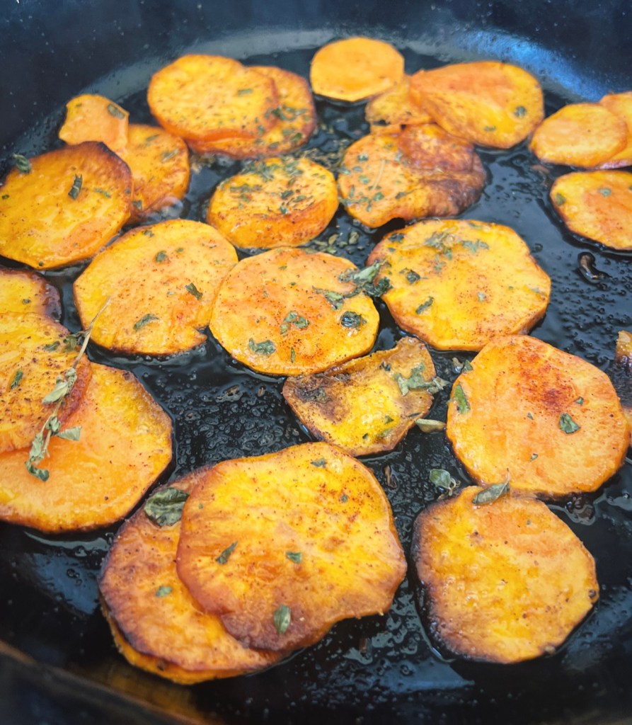 - Simply add a good glug of olive oil into a large cast iron fry pan and add the sweet potato in a single layer and start to fry.