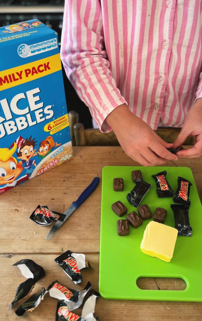 It’s the perfect recipe for a school cake stall, as a treat in lunch boxes or to make for a birthday party. It’s also a really good one for the kids to make. I love how it’s a no bake recipe and bar helping out with the hot molten lava that is the melted mars bars and butter, it’s relatively easy.