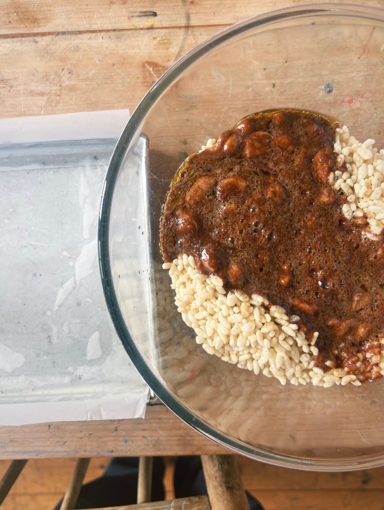 - Pour the hot mixture over the rice bubbles and stir with a wooden spoon.