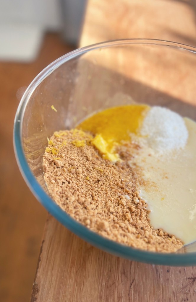 • Add the coconut, condensed milk, melted butter and zest and juice of a lemon and mix together well with a wooden spoon.
