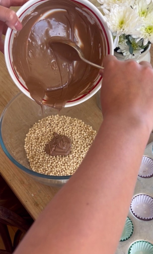 - Add the protein crisps into a large mixing bowl and stir the melted chocolate through until well combined.