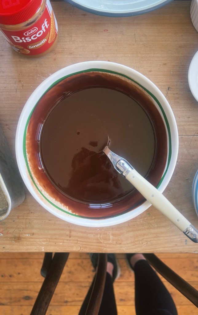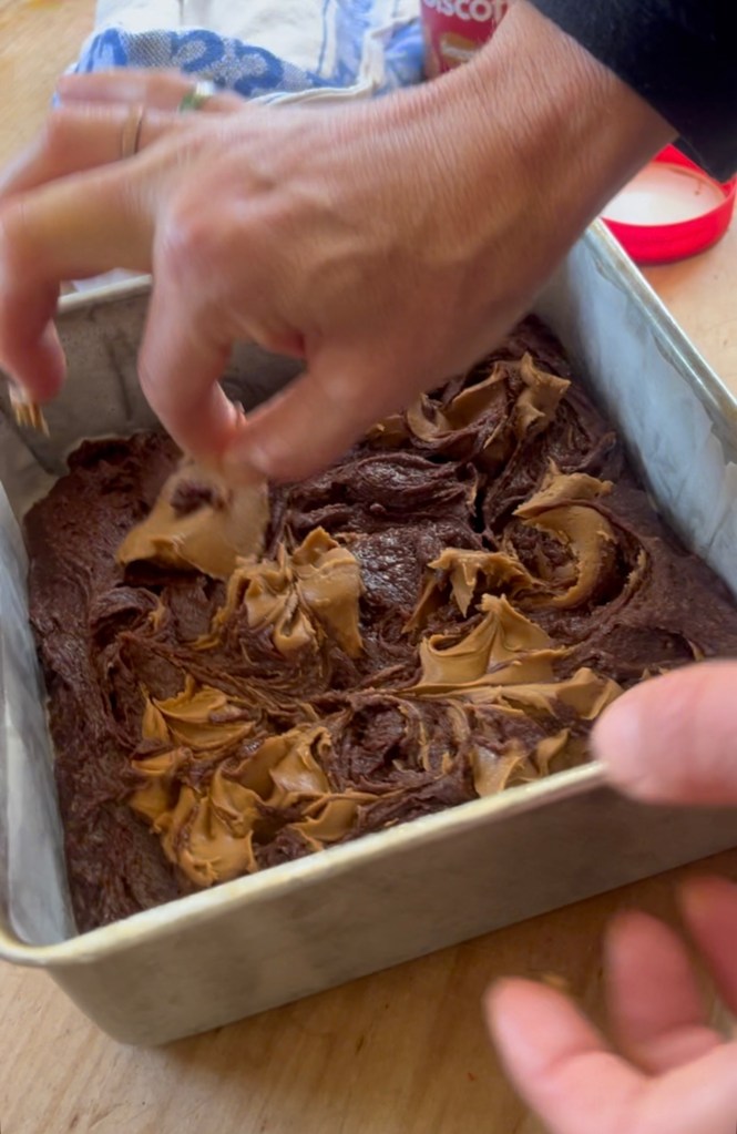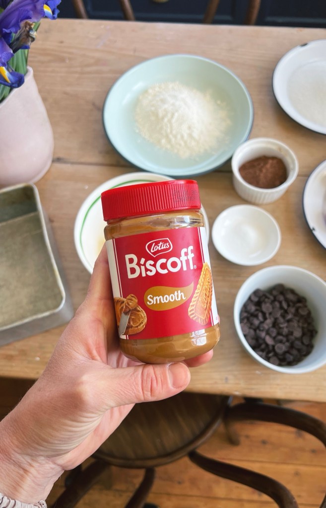 - Scrape out into the prepared tin and spoon out six dessertspoons worth of Biscoff spread in even spaces. Use a toothpick or skewer to spread the Biscoff around to give it a rippled effect.