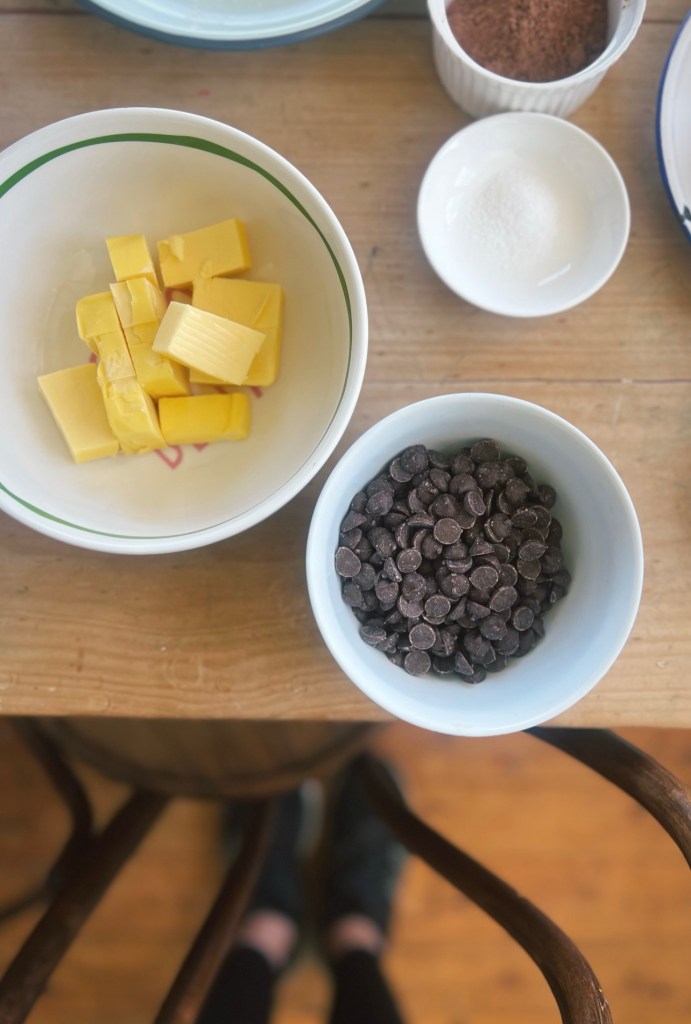 - Melt the butter and chocolate chips in the microwave for one minute. Take out and stir and see if it needs another 30 seconds or so to get it nearly completely melted (the residual heat once taken out of the microwave will keep melting the chocolate). Be careful here as you don’t want it to burn and in my experience – microwaves seem to vary in heat.