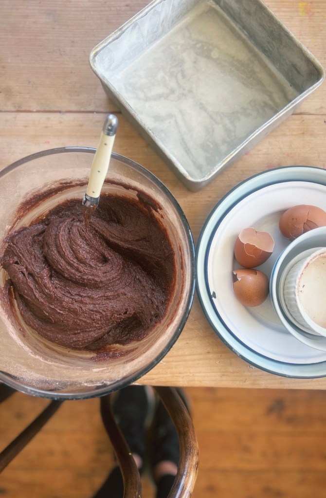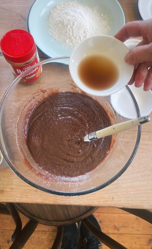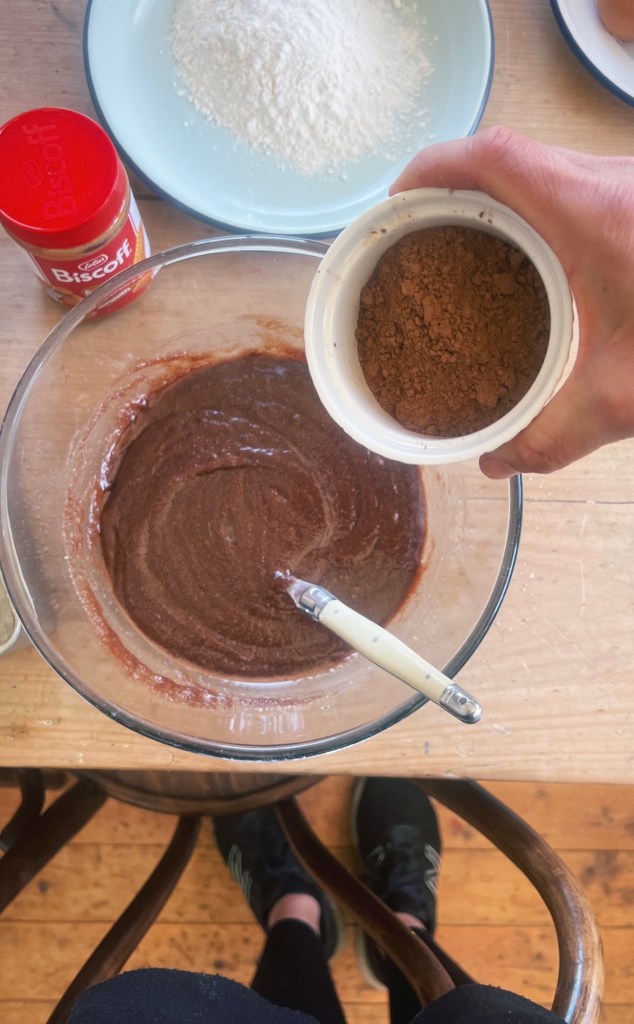 - Then stir through the sugar, vanilla, salt, cocoa and flour until combined.