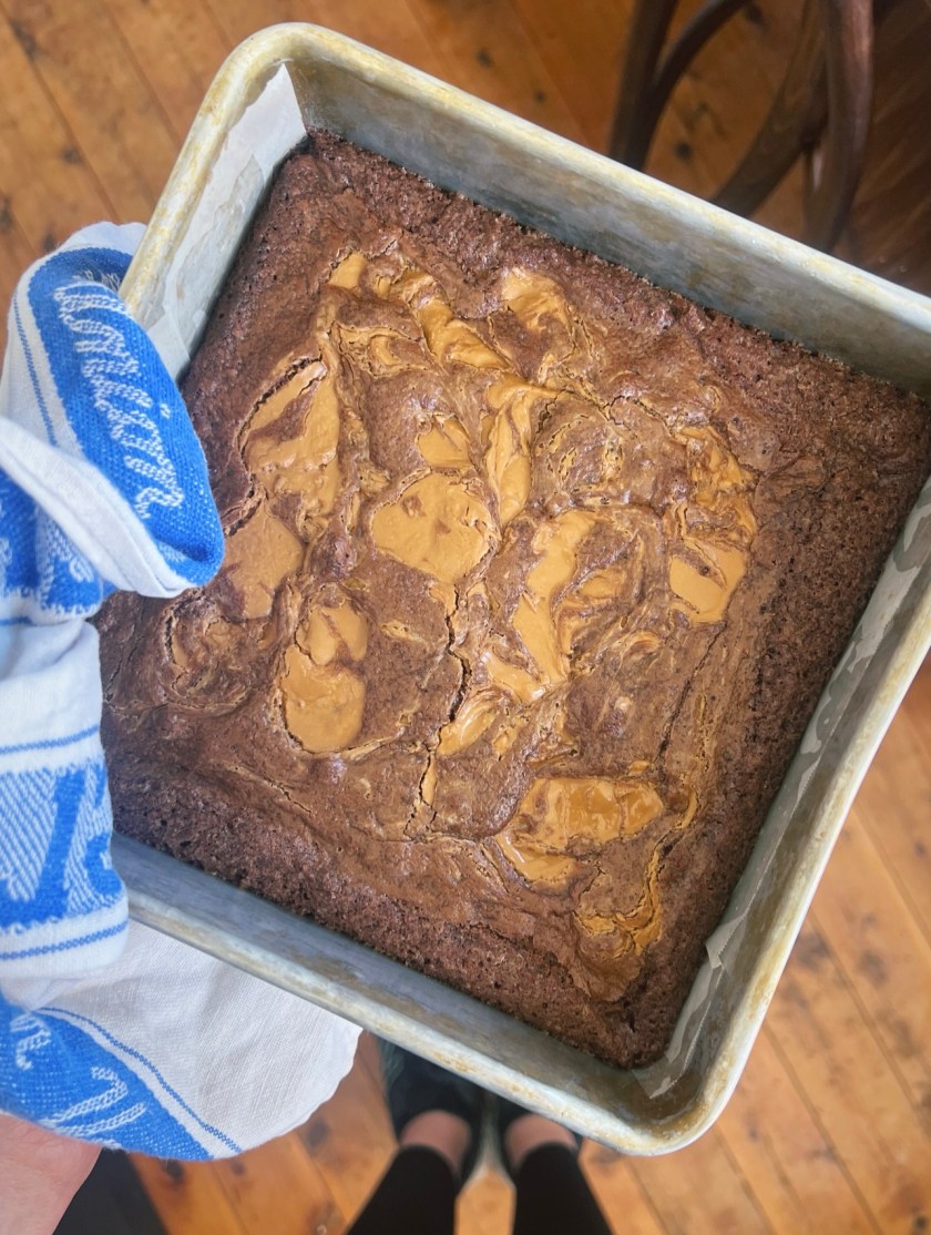 - Scrape out into the prepared tin and spoon out six dessertspoons worth of Biscoff spread in even spaces. Use a toothpick or skewer to spread the Biscoff around to give it a rippled effect.
