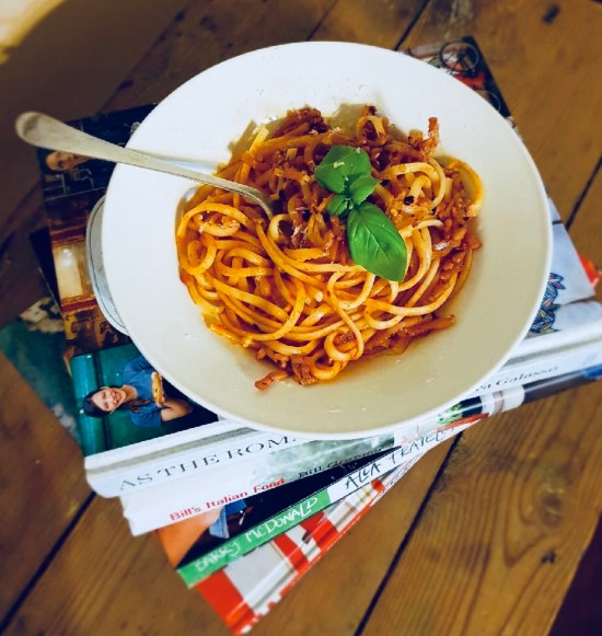 linguine with tomato, garlic & chilli bacon sprinkle