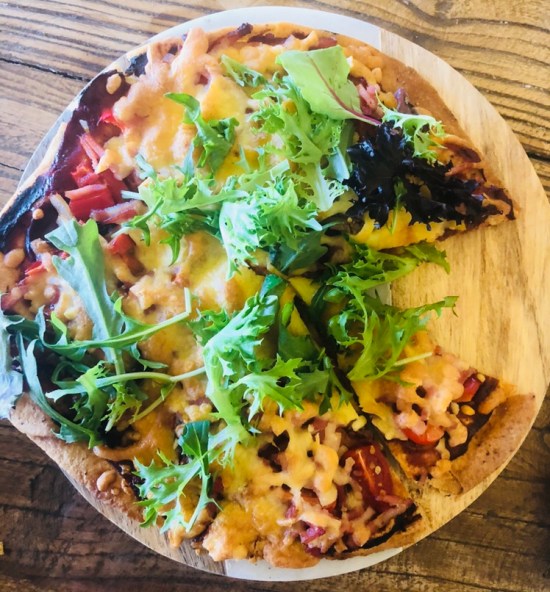cheat’s pizza | prawn + hummus + spinach & bacon + tomato + capsicum